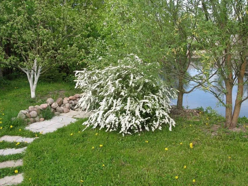 - Spiraea vanhouttei (Вангутта) вырастает до двух метров в диаметре и имеет изогнутые дугой длинные ветви.