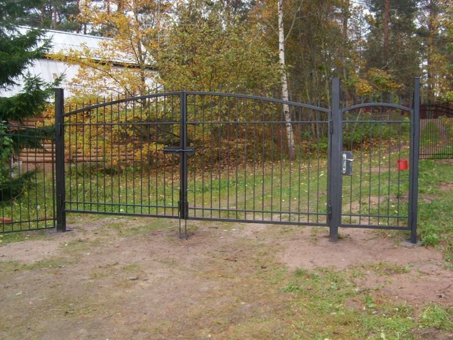 Распашные модели бывают двухстворчатыми или же одностворчатыми. Самая востребованная конструкция: дверь и две створки. Они открываются либо ручным способом, либо автоматически. Полотно к раме прикрепляется с помощью петель. Каркасная конструкция ворот должна быть прочной. Также это касается арочных модификаций со встроенной дверью.