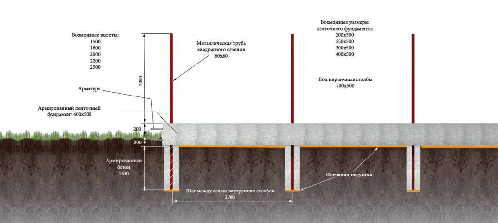 Основание забора по большому счету является обычным ленточным фундаментом, выполненным в различных формах