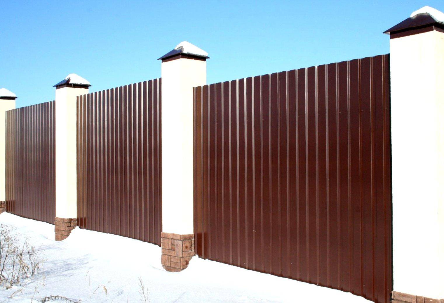 При монтаже забора из металлического штакетника в Средней полосе России, рекомендуют устанавливать столбы из профилированной трубы 60*60 мм (можно 60*40). Для поперечин удобнее брать ту же профилированную трубу, но сечением 40*20 мм. В этом случае ограда точно выдержит ветровые и снеговые нагрузки.