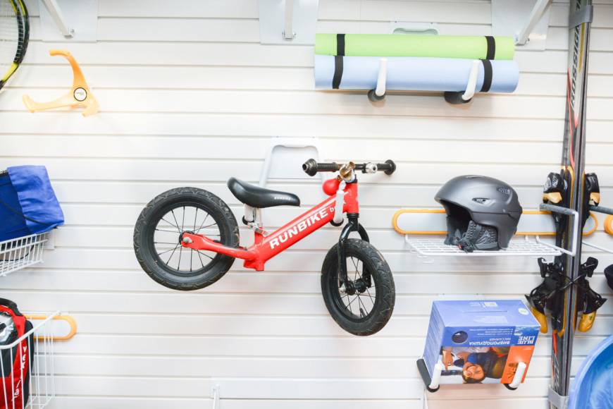 С хранением детских велосипедов теперь тоже не будет никаких проблем. Аксессуары системы GarageTek подойдут не только для них, но и для хранения шлемов, защиты, насоса, велоодежды, перчаток, смазки для цепи, велокомпьютера, запасных частей. Дополнительным преимуществом будет то, что кронштейн легко перемещается на стене, обустроенной нашими панелями. Вы сможете установить его на такой высоте, чтобы Ваш ребенок мог самостоятельно снимать велосипед и возвращать его на место. В таком положении колеса велосипеда легко мыть, а также можно заниматься починкой и апгрейдом верного друга.
