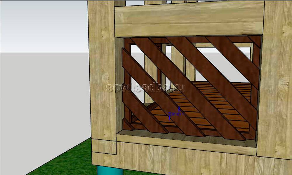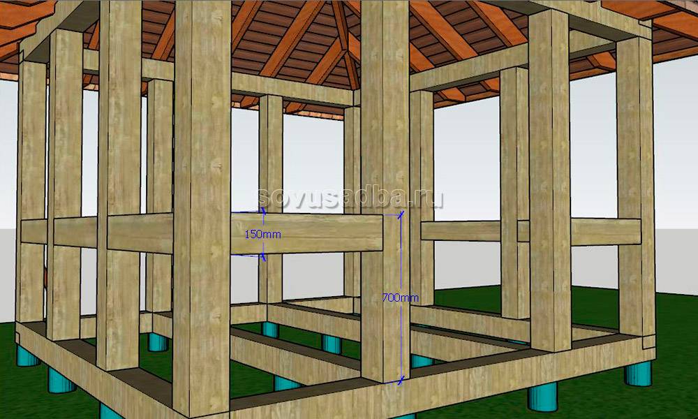 Их нужно выпилить из взятого нами за основу бруса, ну или подобрать для этих целей подходящие обрезки. Советуем устанавливать их в семидесяти сантиметрах от поверхности планируемого пола, но это не правило, а лишь рекомендация.