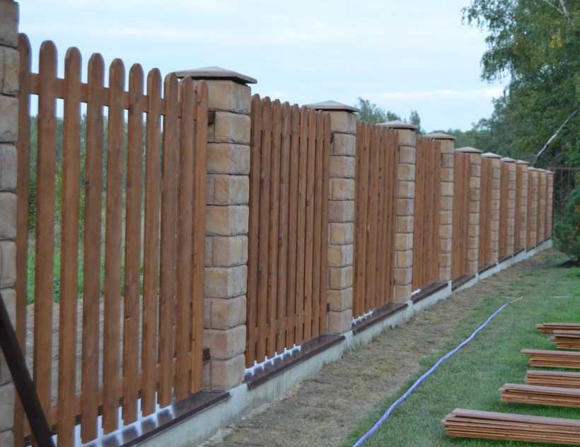 Штакетник нужно прибить так, чтобы его нижний край находился на расстоянии не менее 10 см от земли. Этот промежуток защитит от влажности. Штакетник чаще всего имеют высоту до 150 см, что позволяет построить довольно низкий забор. Чтобы поднять его, часто строят кирпичную или каменную основу. Сочетание дерева с камнем еще больше повышает декоративные качества.