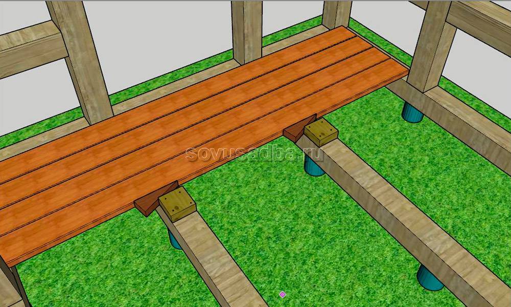 А теперь, собственно сам пол. Для его изготовления возьмите строганую обрезную доску толщиной 40 мм и снимите с ее граней фаски. Это не столько для стиля, сколько для облагораживания будущих щелей, которые в настиле обязательно появятся. Но чтобы это произошло как можно позже, в процессе монтажа поджимайте доски друг к другу клиньями.