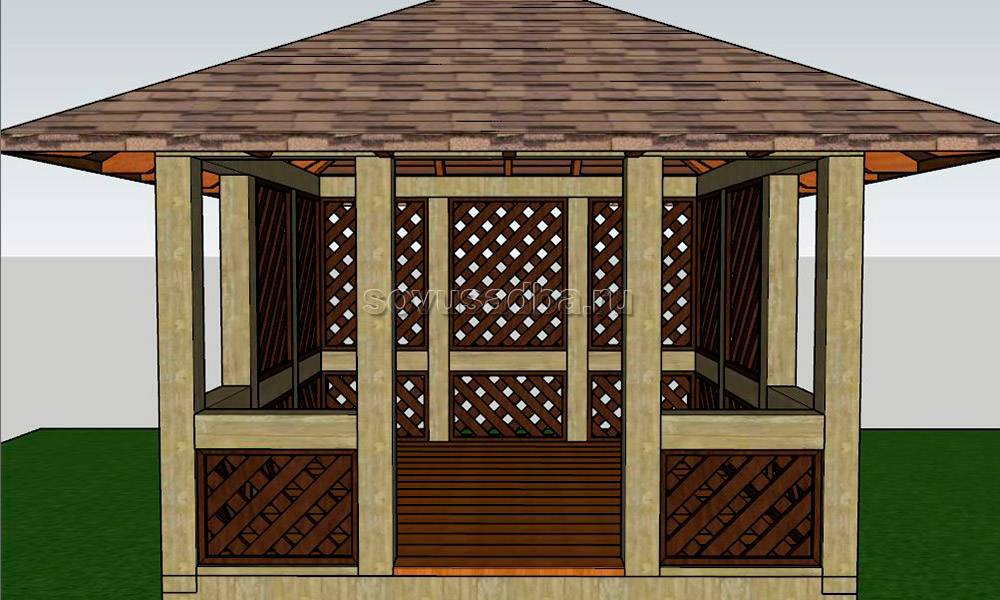 Примечание. От планируемого числа отдыхающих зависят габариты открытого павильона. Чтобы свободно уместить 2—3 человек, хватит помещения 2 х 2 м (с учетом стола и скамеек), а для 10 гостей уже понадобится площадка 4 х 4 м.