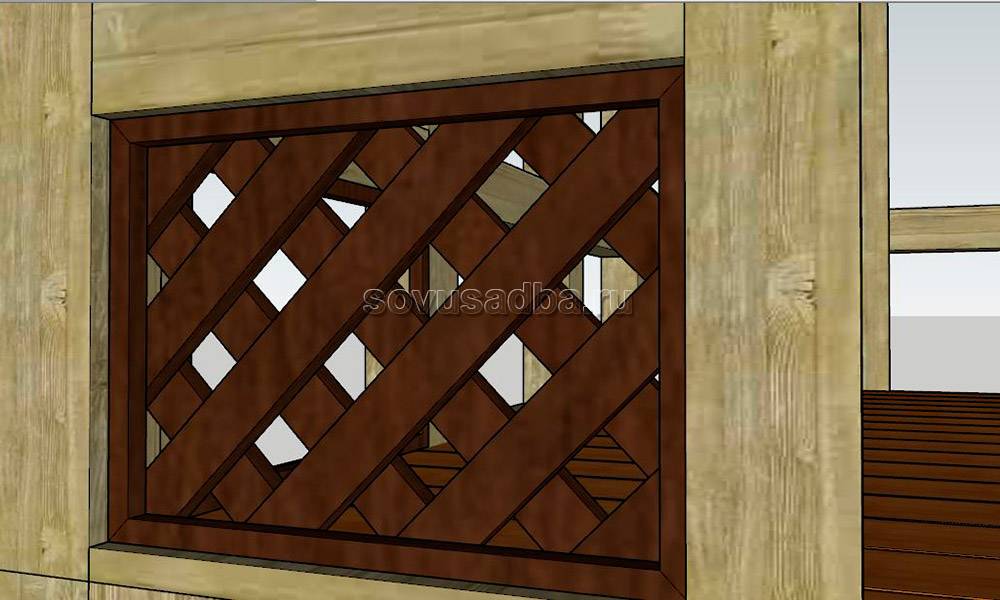 А вот для фасадов понадобится строганая тридцатка. Нарежьте ее на рейки сечением 30х30 и 70х30 мм. Из первых сделайте парные рамочки, вторые сложите в решетки. И наш вам совет: чем заниматься подрезкой по месту, проще сделать две рамки, сложить между них решетки и спокойно обрезать все лишнее. Хотя, это дело вкуса. Если время позволяет, можно пойти и по сложному пути.