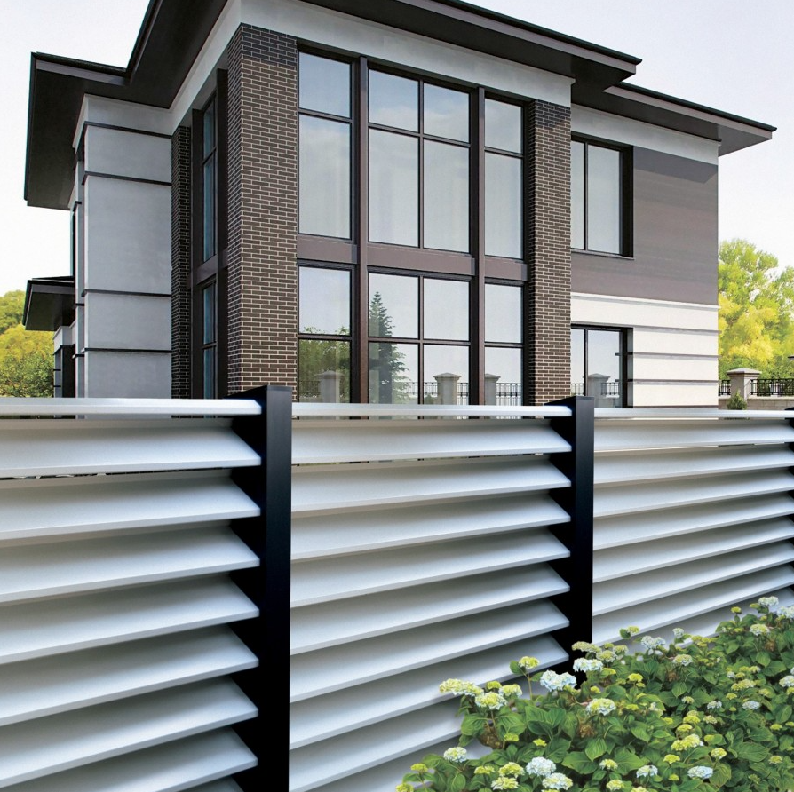 Важное преимущество реечного забора из металла в том, что его можно не красить. Планки уже продаются в разных цветах, что позволяет подобрать подходящий для вашей конструкции