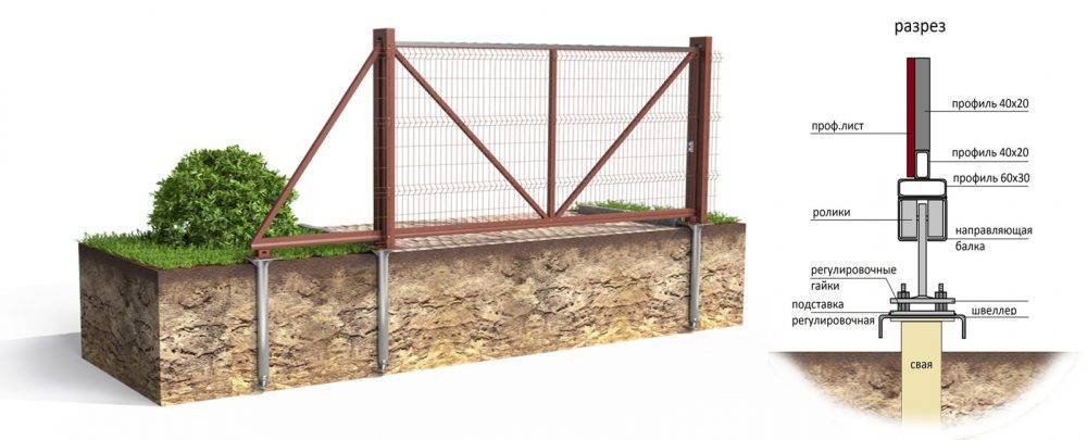 Также некоторые пользователи интересуются, как можно установить откатные ворота. Для монтажа вам нужно будет вкрутить несколько коротких винтовых опор, а затем приварить швеллер. К самому швеллеру привариваются ролики, по которым будет перемещаться полотно.