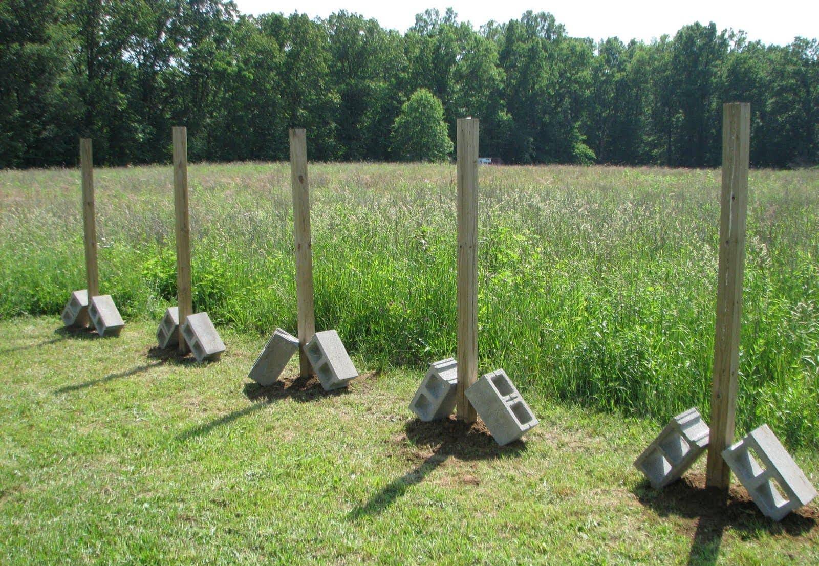 В лунки погружают опорные столбы. В ямы на высоту 300 мм засыпают щебень, потом битый кирпич, землю и хорошо утрамбовывают. Затем снова щебень, битый кирпич и землю. Сверху заливают бетоном.