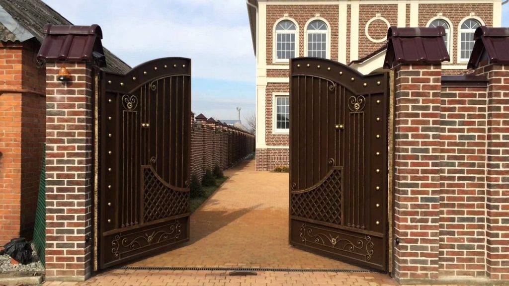 Полотно распашных ворот изготавливается из различных материалов. Это наиболее гармоничная конструкция с визуальной точки зрения