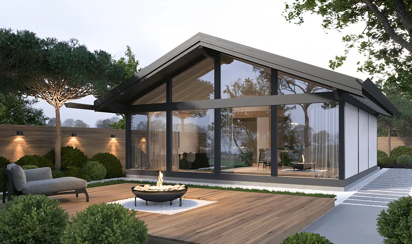 Благодаря панорамному остеклению дом всегда наполнен солнечным светом. | Для того, чтобы панорамное остекление было максимально прочным, предполагается установка бронированных окон или триплекса. |