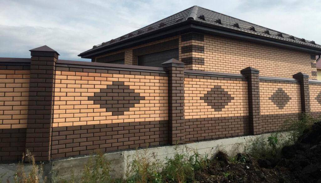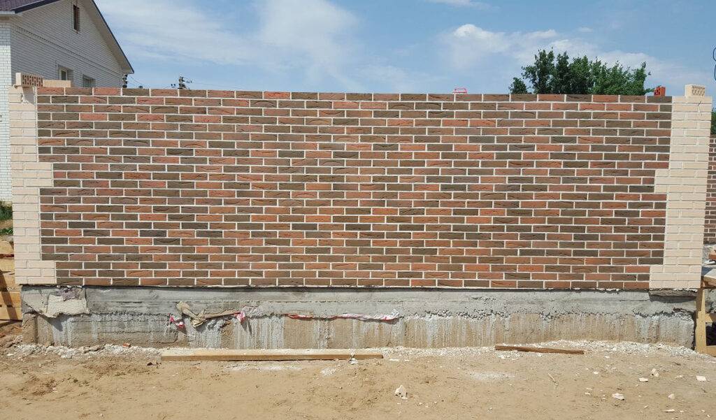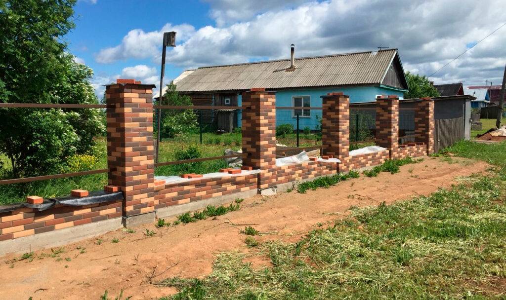 Когда бетон полностью застынет, переходят к укладке кирпича. Здесь действуют в соответствии с проектными данными — выводят столбы нужного размера и высоты, укладывают нижнюю часть секций (как правило, это продолжение цоколя).