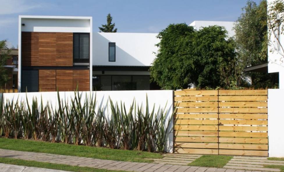 Современный забор «частокол» из деревянного бруса оживляет слижком уж минималистичный урбанистический пейзаж, однако не выбивается из общего стиля.