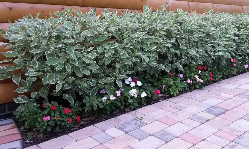 - из дерева — редкий забор украшают высокими цветами (мальва, гортензия или подсолнух), дополняя лианами, и высаживают по периметру тенелюбивые среднерослые культуры, а сплошное деревянное ограждение — кустами малины, смородины, сирени и низкорослыми петунией, бархатцами, лобелией, высаженными на возвышении;