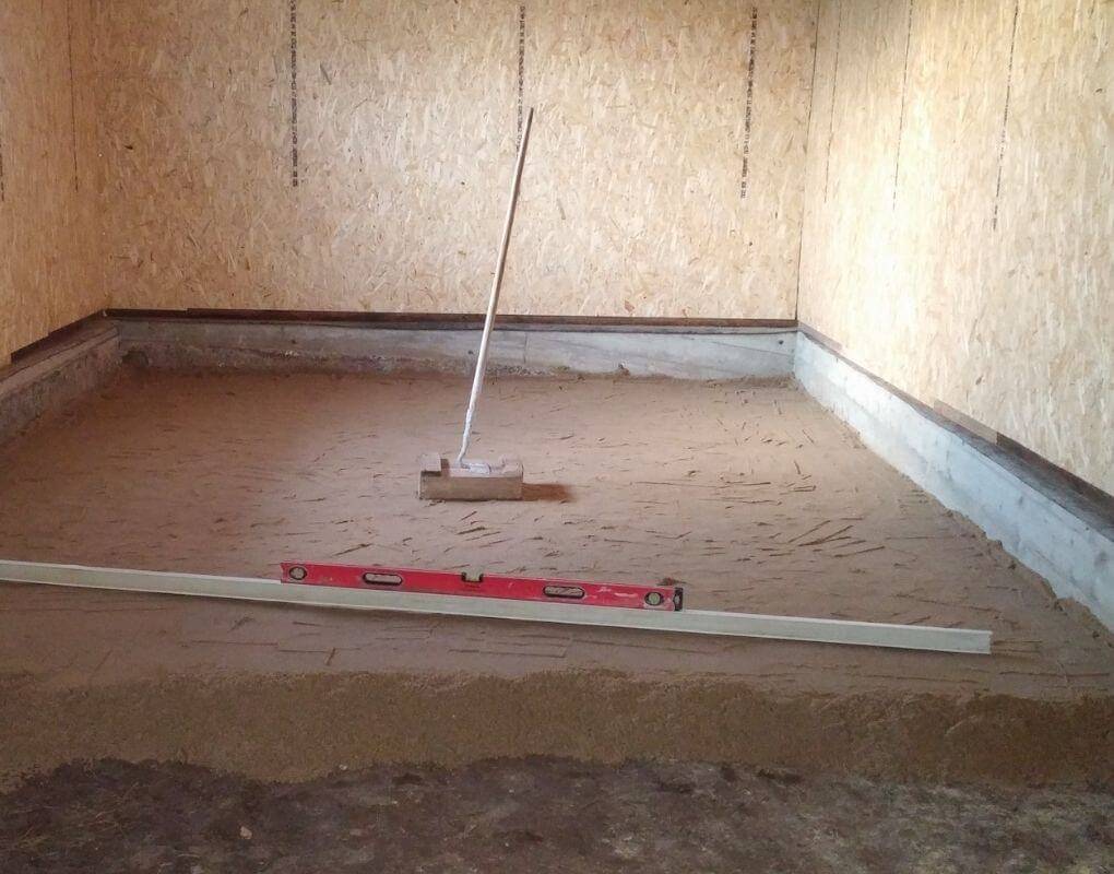Перед заливкой бетона, рабочие засыпают подготовительные слои из песка и щебенки. Во избежание ошибки, нужно рассчитать нулевой уровень полов. Чаще всего поверхность ровняют с уровнем порога