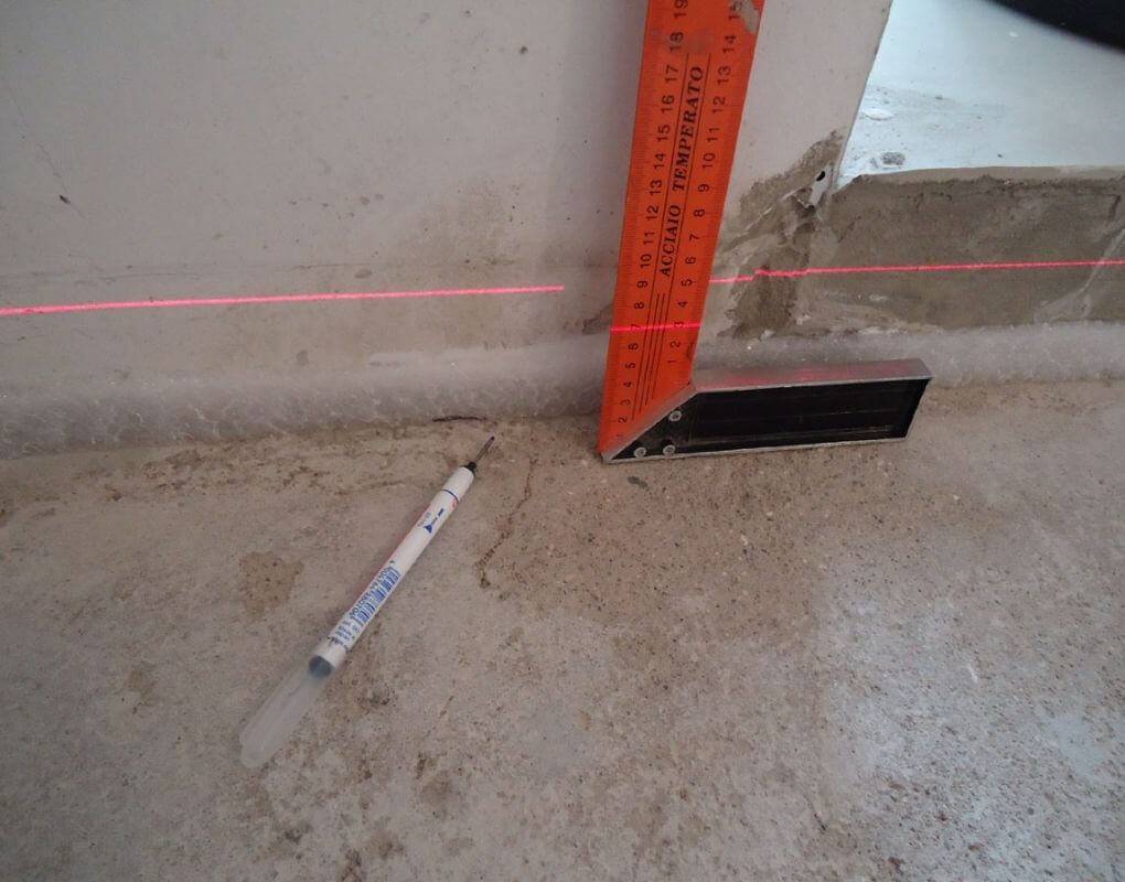 Уровень прорисовывают по траектории луча, образованного при помощи нивелира либо электронного уровня. Если под рукой нет лазерного прибора, то используют водяное устройство, не менее точное, но подразумевающее больший объем работы при замерах. Отметки делают на стенах несколько раз, а потом соединяют их между собой