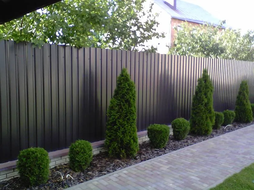 Высокий глухой забор из профлиста станет хорошим фоном для высоких кустарников и деревьев, лиственных или хвойных. Не слишком красивый низ изгороди можно закрыть плотным бордюром из декоративнолиственных многолетников или хвойных растений, посаженных в ряд. При выборе цветущих растений учитывайте цвет самой изгороди и высаживайте цветы по принципу контраста, чтобы они не сливались с оградой.