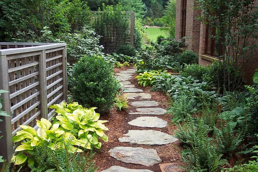 Низкорослые многолетники вдоль деревянного забора и по над дорожкой