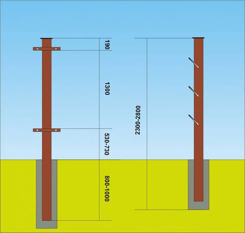 Если почва, где планируется установка ограждения песчаная глубина погружения опоры увеличивается, каменистая увеличивать глубину нецелесообразно, достаточно 80 сантиметров. Существуют требования при формировании отверстия. Максимальная устойчивость достигается, когда отверстие немного больше опорного столба. Слишком маленький диаметр ограничивает возможность залить достаточное количество бетонного раствора. Достаточным диаметром считается показатель от 15 до 30 сантиметров. Расстояние между столбами высчитывается с учетом местных особенностей, погодных условий. Пролет между столбами принято делать 2,5-3 метра. Такое расстояние обеспечивает максимальную надежность, устойчивость, долговечность опоры.