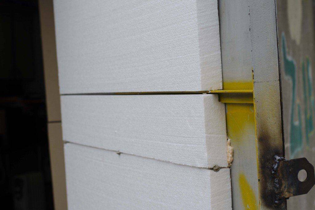 Монтаж утеплителя. Нарежьте пенопласт на панели нужного размера. Для фиксации используйте монтажную пену, которая также обладает теплоизоляционными свойствами, или любой подходящий клей.