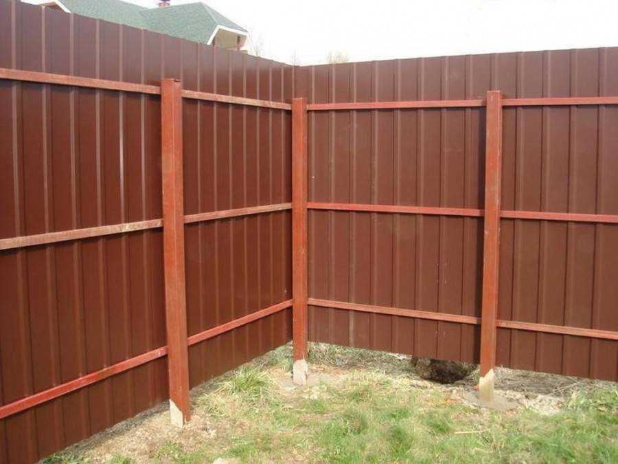 - Для заборов из профнастила нужны столбы крепкие, прочно стоящие на земле. Можно обработать для этой цели деревянные столбы, сделать их более тяжелыми, можно взять кирпичные столбики. Но лучший вариант — это металлические столбы, которые хорошо удержат не очень тяжелые листы профнастила;