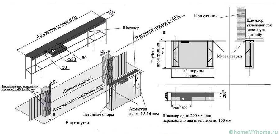 5. 15-20 см швеллер будет использоваться для монтажа закладной. Еще раз повторимся, что его длина должна быть не меньше половины длины проезда ворот (в нашем примере 2 м)