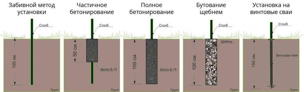 Исходя из требования о небольшом весе конструкции, для забора без укрепления бетонированием не подходят кирпичные, каменные, монолитные бетонные опоры. В зависимости от материала секций забора выбор останавливают на деревянных либо металлических столбах.