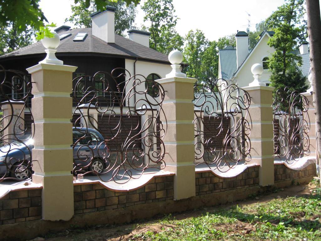 Третий вариант — с использованием кованых элементов лишь в верхней части стены. При этом сам забор выполнен в технике глухой кладки, то есть без зазоров. Ковка в данном случае носит лишь декоративную и защитную функции.
