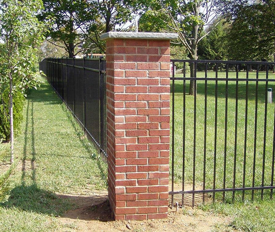 Металлический забор с кирпичными столбами.