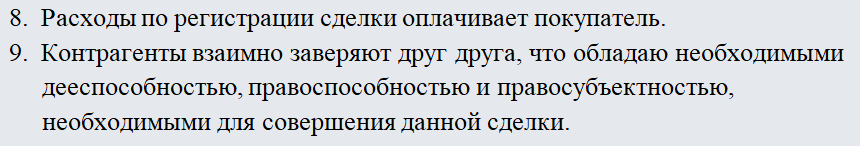 - Стороны договора подтверждают, что не лишены дееспособности, не состоят под опекой и попечительством, не страдают заболеваниями, препятствующими осознать суть договора, а также отсутствуют обстоятельства, вынуждающие совершить данный договор на крайне невыгодных для себя условиях.