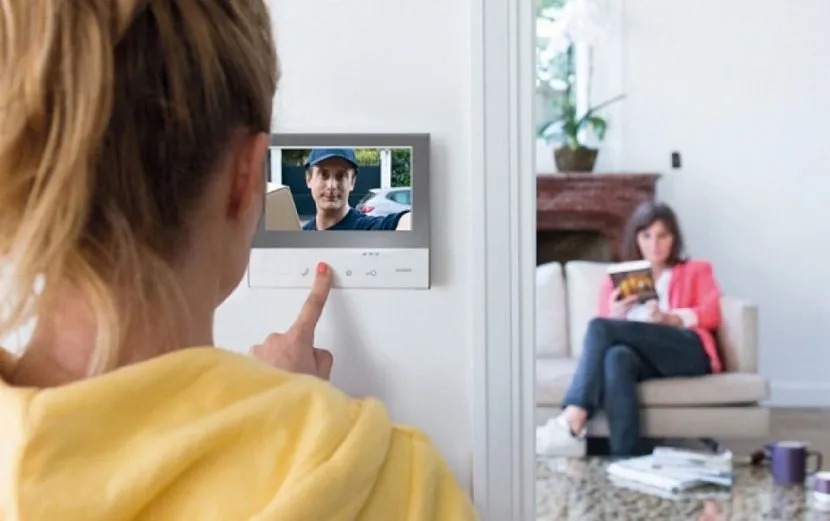 - Домофон. Это цельная система, состоящая из кнопки вызова, которая подает сигнал в квартиру и приемника. Также в наличии имеются динамики и встроенный микрофон, что позволяет общаться хозяевам дома и посетителям между собой. Может оборудоваться камерой.