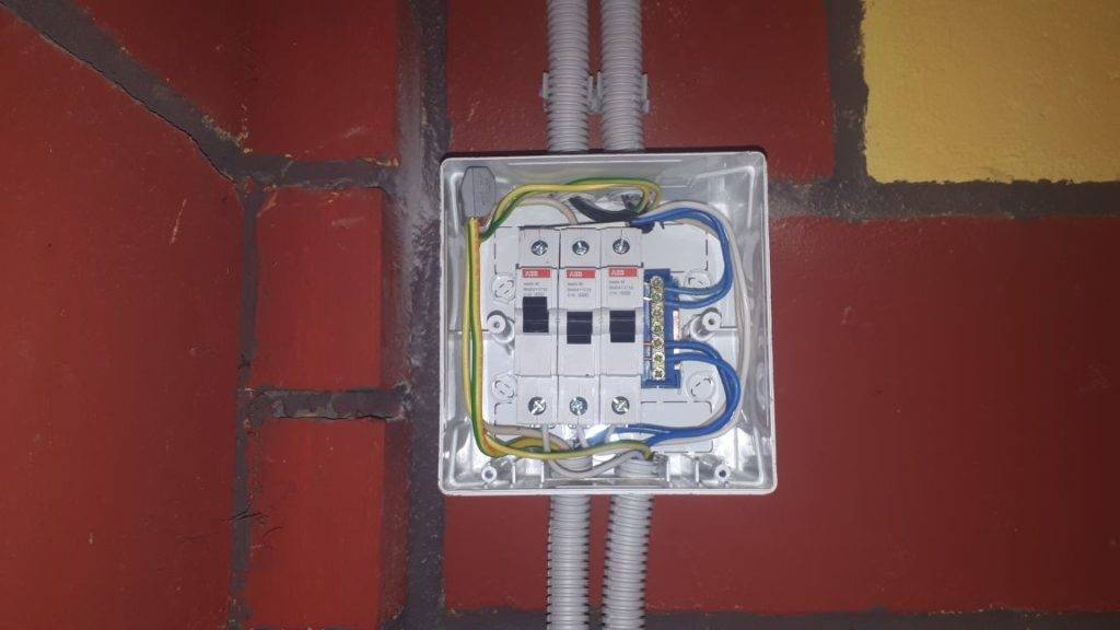 В простейшей схеме могут даже не перерезаться, а уходить сразу в короб распределения питания, если этот провод имеет одну трассу. В случае, если разводка производится от щита электропитания по нескольким трассам — на лампы освещения, розетки, выключатели и т.д., в щите монтируются три контактные линейки, к которым подключаются провод «фаза» от электросчетчика и провода «нуль» и «земля».