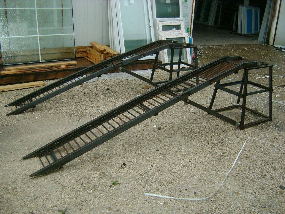 Для устойчивости ножки свариваются в виде трапеции — их нужно соединить балками из равнополочного уголка размером 63х5 сантиметров. Мостики для заезда выполняются в виде лесенки. Для этого используются уголки размером 40х4 сантиметра и арматура диаметром 12 миллиметров.