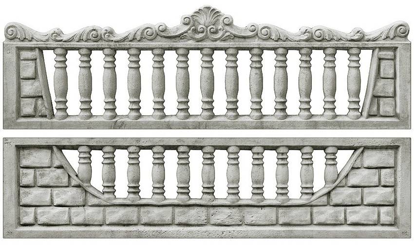Наборные бетонные заборы отличаются высокими декоративными качествами. Каждый набор состоит из 2-4 элементов размером 50х200 см, которые изготавливаются в разных вариациях фактуры и расцветки. Они могут быть однородными, с имитацией под камень, дерево или кирпич, содержать изображения и узоры. Плиты могут быть глухими или сквозными с орнаментом. Секции производятся с матовой или глянцевой поверхностью.