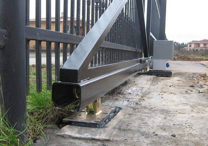 Во первых, нет ни рельсов на земле, ни направляющих вверху. Во-вторых, не видно и роликов. Ворота плавно скользят, направление им задают две видимых точки опоры, находящиеся сбоку от въезда. Это каретки с роликами; они скрыты от глаз, находятся внутри профиля, прикрепленного к нижней штанге рамы ворот. Каретки с роликами приварены к основанию, под которым расположен мощный фундамент, не менее 1,5 м; по этим роликам, вращающимся на месте, скользит полотно ворот.