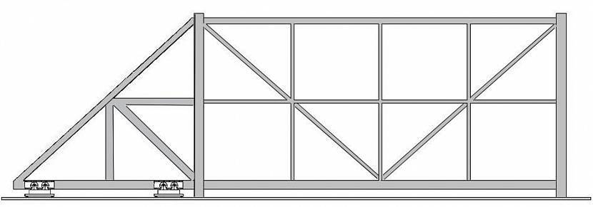 В таких конструкциях усиленный направляющий профиль опирается на столбы ворот или монтируется в проеме стены гаража, а роликовая система держится на верхней балкеПри этом сами ролики располагают по краям и центру каркаса