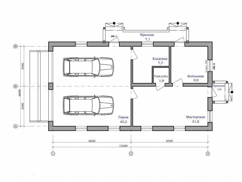 Такая постройка чаще всего рассчитана на два авто, а к ней пристроена просторная мастерская. Лучше всего в помещения сделать отдельные 3 входа, но внутри их можно соединить дверными проемами. Такой тип постройки прекрасно подойдет для просторного приусадебного участка.
