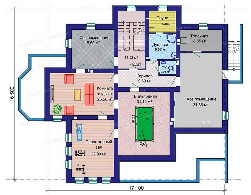 - Проектирование подземного этажа может разместить те помещения, функционал которых не вписывается в общий стиль дома. Например, спортзал, бойлерная, постирочная, игровая комната, мастерская и др.;