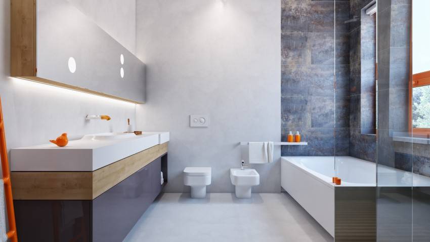 Если используется кафель, он не должен быть пестрым или рельефным. Классическая плитка строгих форм — то что нужно. Удачным решением будет комбинирование отделки, например, одна стена оформлена кафельной плиткой, остальные — бетон или кирпич, возможно стеклянные блоки.