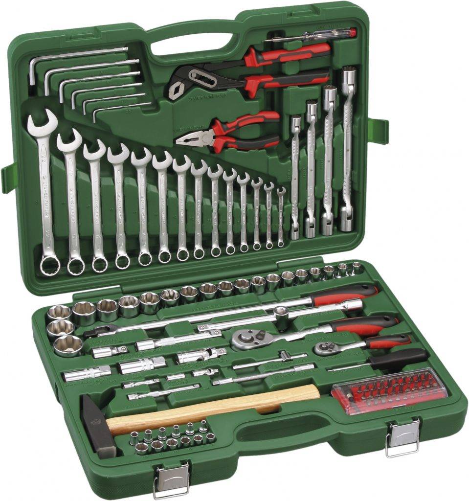 Этот набор такого же класса, что и Jonnesway, но только с большим количеством предметов (и цена соответственно несколько выше). Помимо комбинированных и разрезных ключей здесь дополнительно имеются имбусовые ключи под шестигранные головки. Они будут полезны не только для ремонта автомобиля, но и для сборки мебели. Помимо прочего в комплект входят пассатижи, 6 отверток под шлиц и шестигранник, одна отвертка-битодержатель для 26 бит и молоток. Как и в других наборах, здесь есть 4 воротка, включая удлиненный Г-образный для откручивания колесных болтов и других крепежей, требующих большого усилия.
