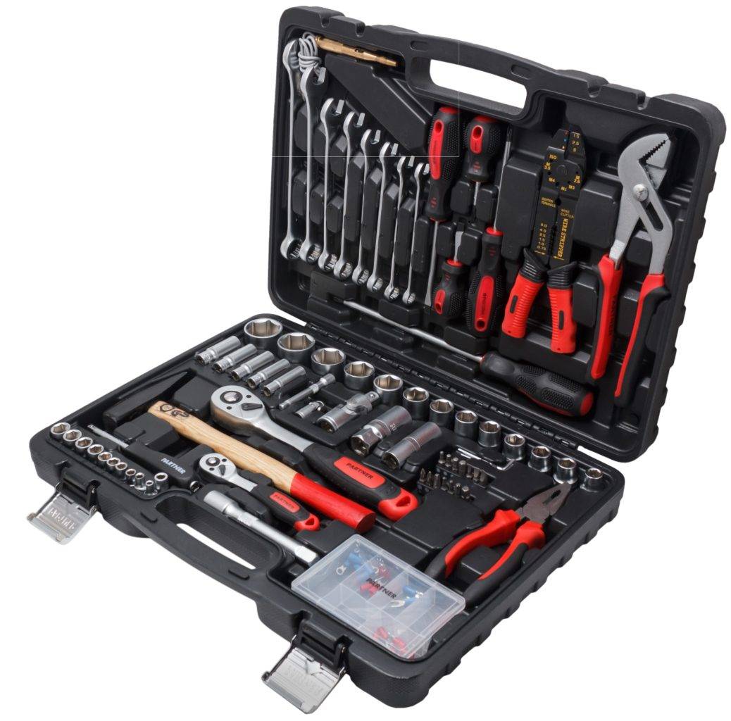 Набор в прочном чемодане славится универсальностью, шарнирно-губцевым инструментом, достаточным количеством отверток, а также вместительностью. Здесь присутствует порядка 186 предметов, которые можно использовать даже каждый день. Но особенно сильно покупателей радует ручка чемодана – она имеет нескользящее покрытие и является действительно прочной и комфортной.