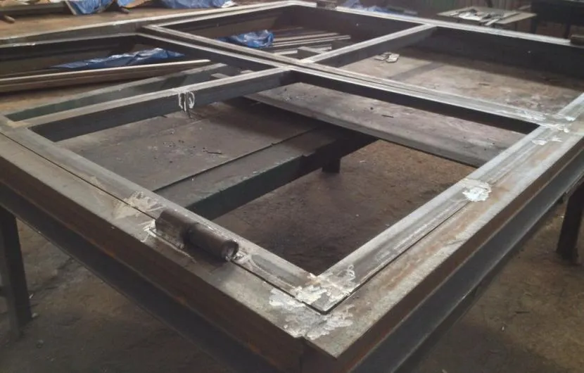 Рамы створок изготавливаются из металлических заготовок. Каждый элемент очищают от коррозии и грязи, после чего соединяют друг с другом. Верхние углы рекомендуется приваривать под углом 45 градусов, чтобы предотвратить проникновение в них жидкости. При необходимости после сварки усиливают каркас и зачищают места стыковки металлических заготовок. Поверхность каркаса обезжиривают, обрабатывают грунтовкой и окрашивают.
