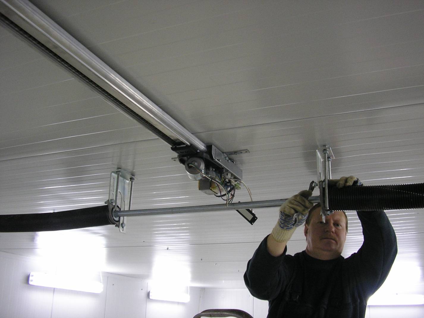 - На потолке. Используется под полотна небольших размеров, в гаражах, рассчитанных на один легковой автомобиль. Фиксируется на потолке на расстоянии 1‒2 м от проема. Трос крепится вверху створки с помощью рычага, что создает тягу. С помощью этого троса дверь открывается.