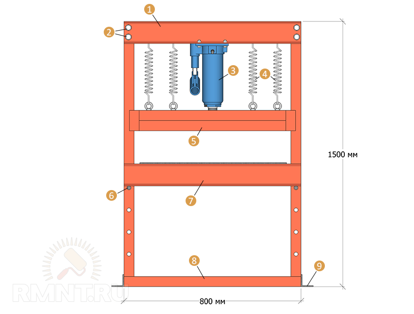 Рама используется со сдавливющим усилием до 5 тонн | 1 (упорна балка сверху); 2 (крепежные элементы); 3 (домкрат до 20 т); 4 (пружинный механизм); 5 (подвижная конструкция); 6 (стопор); 7 (приспособление для регулировки); 8 (поперечная конструкция); 9 (опорные ножки). |