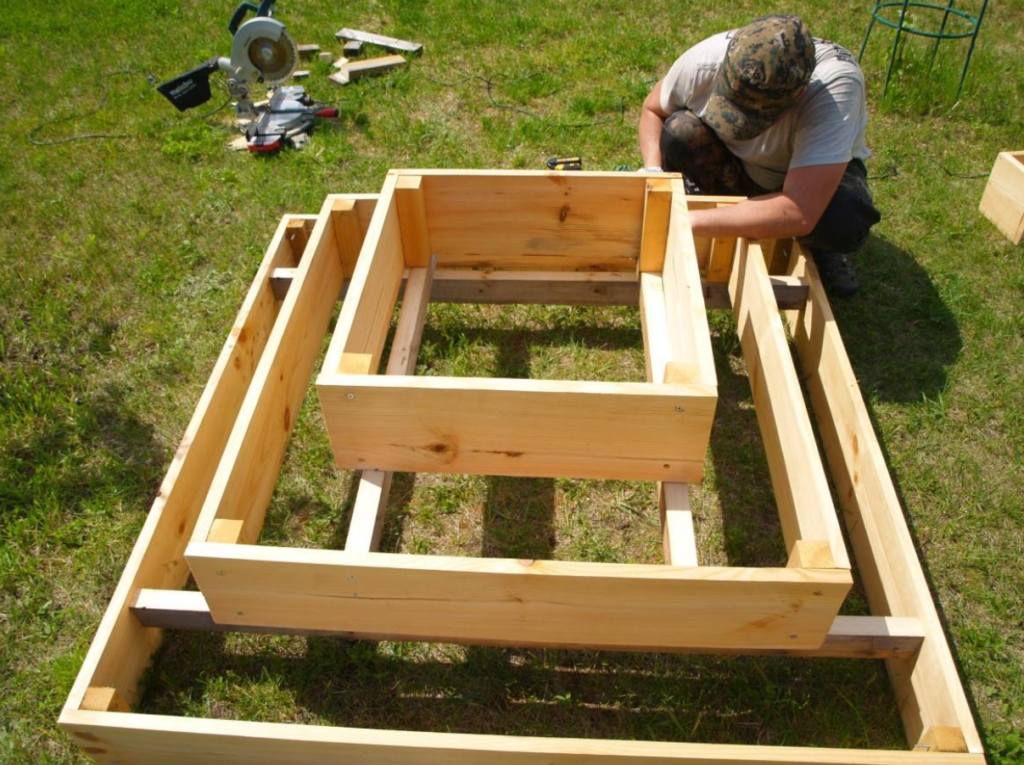 Экологически чистые и долговечные грядки можно сделать из деревянных досок. Сначала сбивают несколько коробов с разным периметром так, чтобы получилось собрать пирамиду.