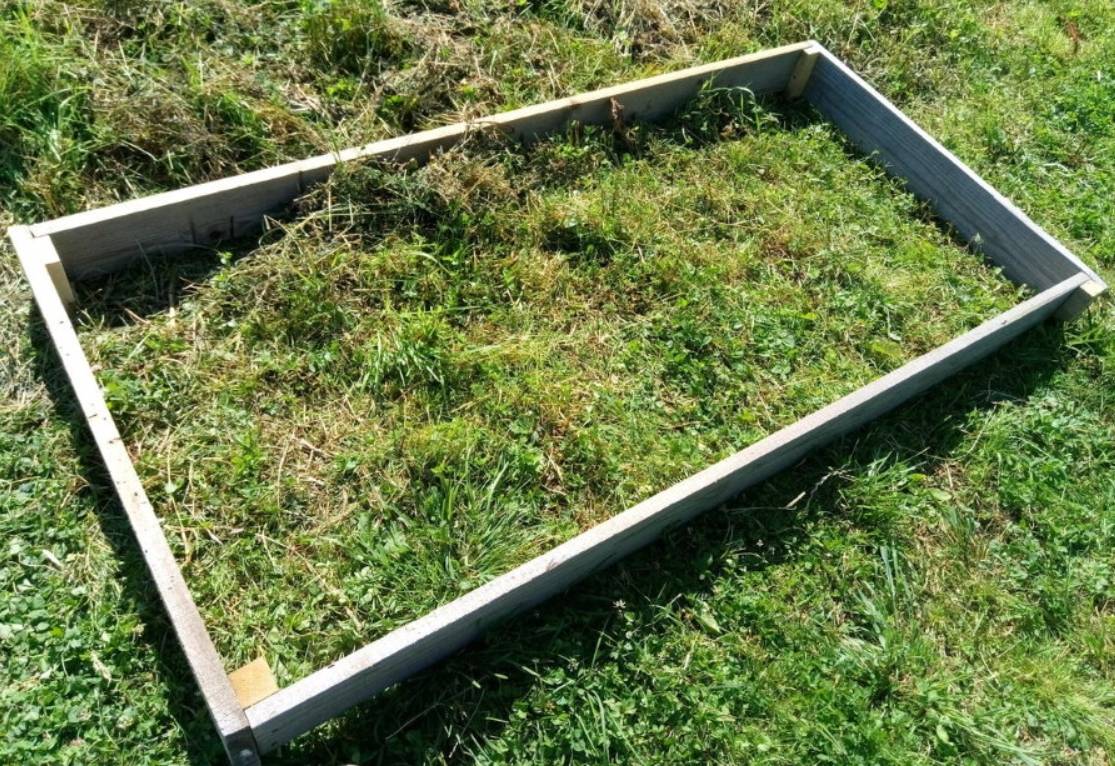 Переверните короб ограждения и забейте опорные бруски в грунт в подготовленном месте. Уровнем проверьте горизонтальность установленной грядки.