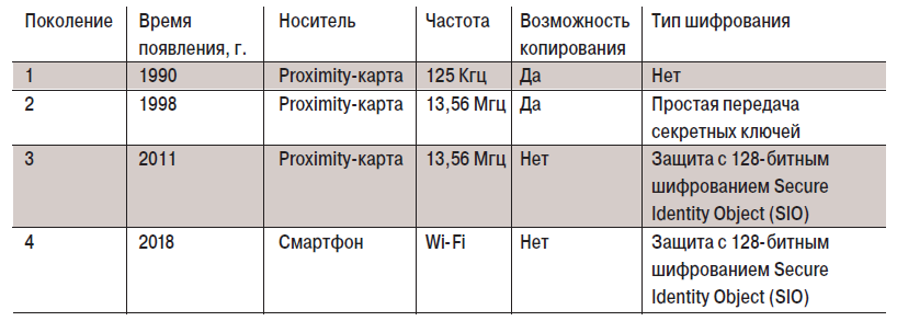 Поскольку современные бесконтактные смарт и RIFD-карты используются не только для прохода, но и для входа в ИТ-сеть организации, становится актуальным вопрос о защите карт от копирования. В табл. 1 показаны четыре поколения карт по степени защищенности.