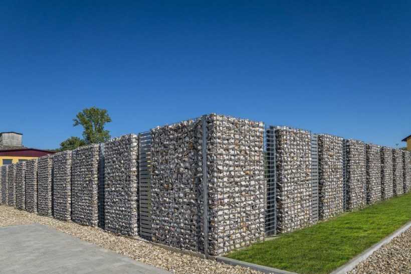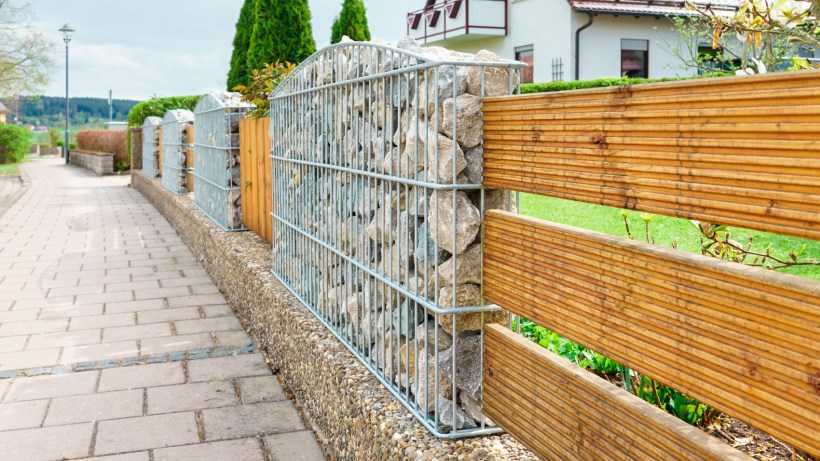 - Габионы — одновременно стильное украшение и серьезная преграда. Можно обнести территорию только ими, либо сочетать сетки с камнями с деревом, металлом, кирпичом.