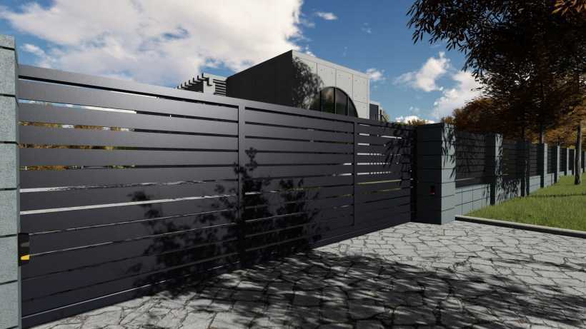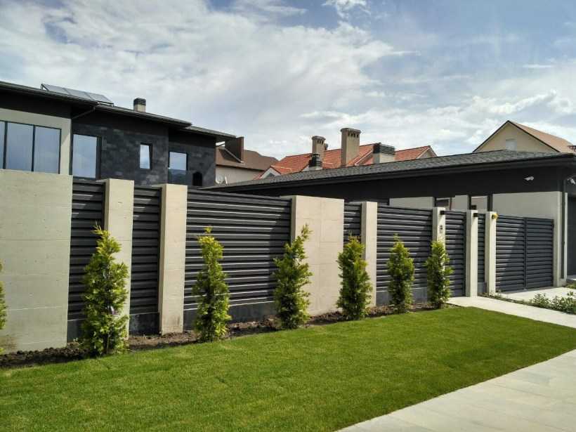 Ограда-жалюзи – это самый интересный и привлекательный заборный вариант. Он имеет отдельные секции, которые делаются из профилированных труб. К ним дополнительно крепятся горизонтальные панели. Отличается от других вариантов несложной установкой и высокими показателями качества. Из них получаются отличные ворота. Можно в этих целях использовать и сайдинг.