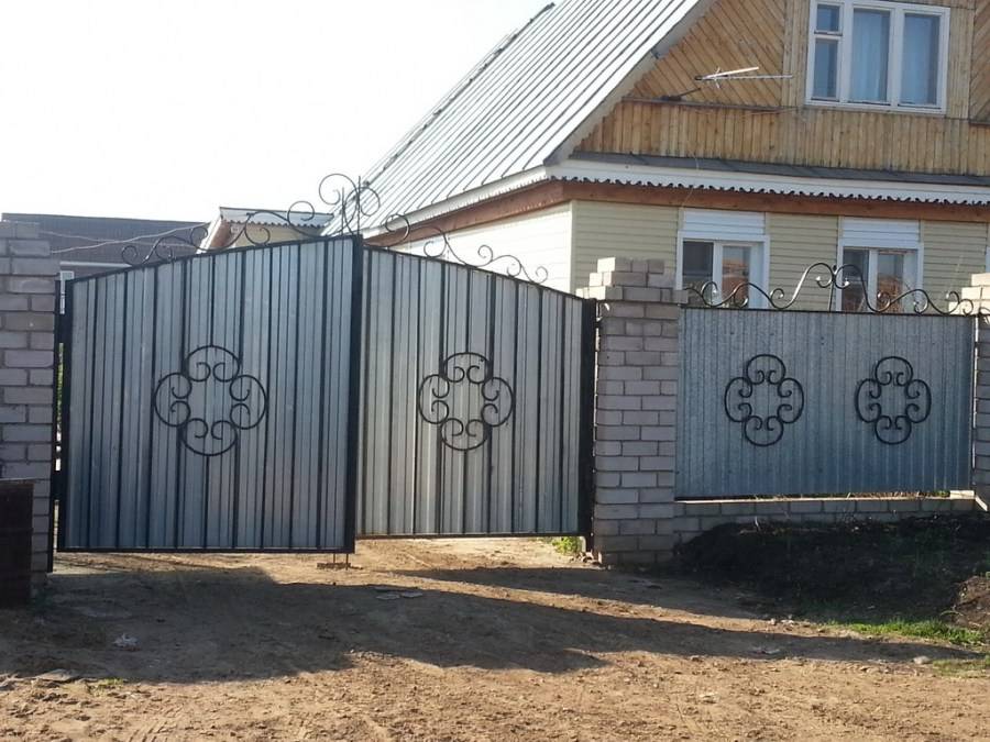 Что касается окраски или оцинковки, то желательно, чтобы профнастил на воротах был таким же, как и на заборе. Излишняя пестрость не прибавит эстетичности.